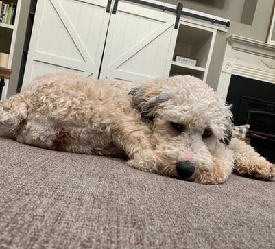 This is our lovely May. After retiring Bubbles we decided to take on May to help out a friend trying to re-home her. We were grateful to add this pretty girl to our family. She is a black and white moyen Aussiedoodle weighing around 33 lbs. May's birthday is May 1, 2017. She adapted really well here and LOVED all the other dogs. May enjoyed running around the garage, destroying toys, and licking anything in her sight. May found her forever home with one of our previous buyers and is living her best life as the queen of the house!